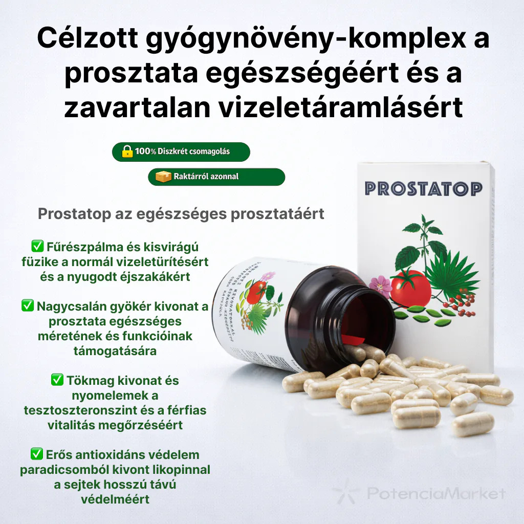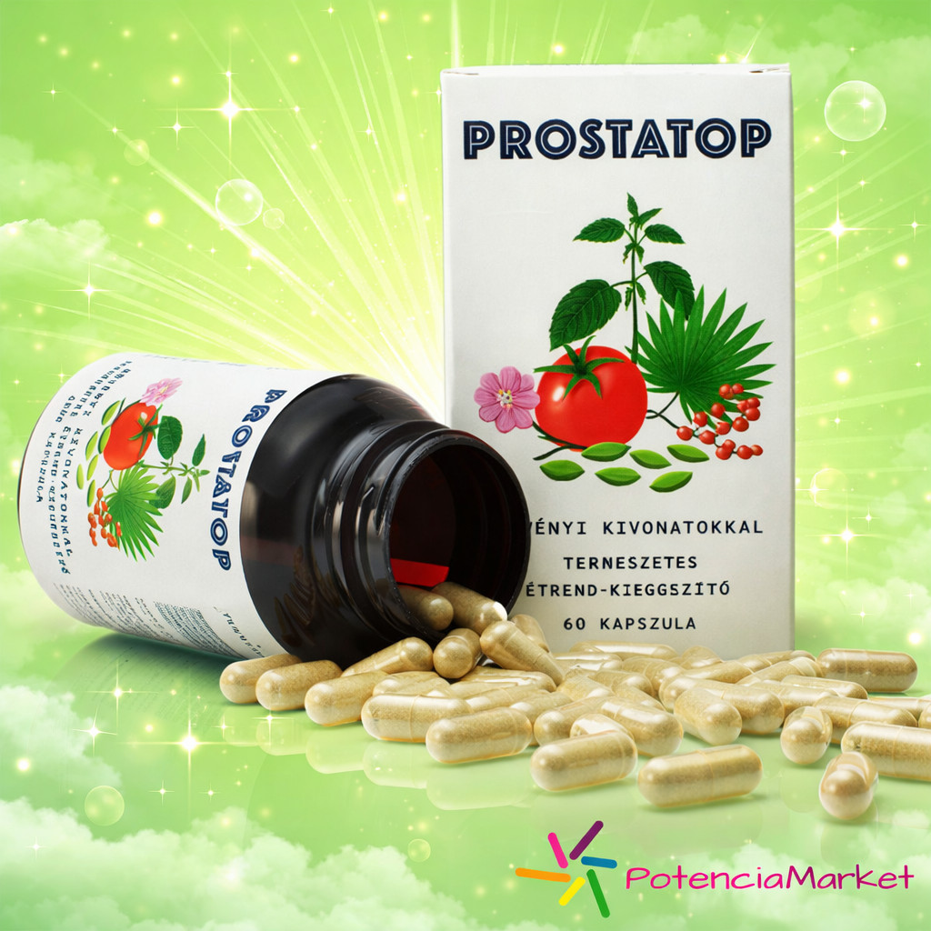 A Prostatop növényi kivonatokkal a prosztata egészségének megőrzésében, a Benignus prostata hyperplasia (Jóindulatú prosztata megnagyobbodás) tüneteinek enyhítésében nyújthat segítséget. Fűrészpálma, más néven szabalpálma kivonatot tartalmaz, mely elősegítheti a normális vizeletáramlást és a prosztata egészségének megőrzését. Másik fő alapanyaga, a kisvirágú füzike kivonat hozzájárulhat a húgyúti rendszer megfelelő működéséhez 45 év feletti férfiak esetében, míg a nagycsalán gyökér kivonat hozzájárulhat a prosztata egészségéhez.